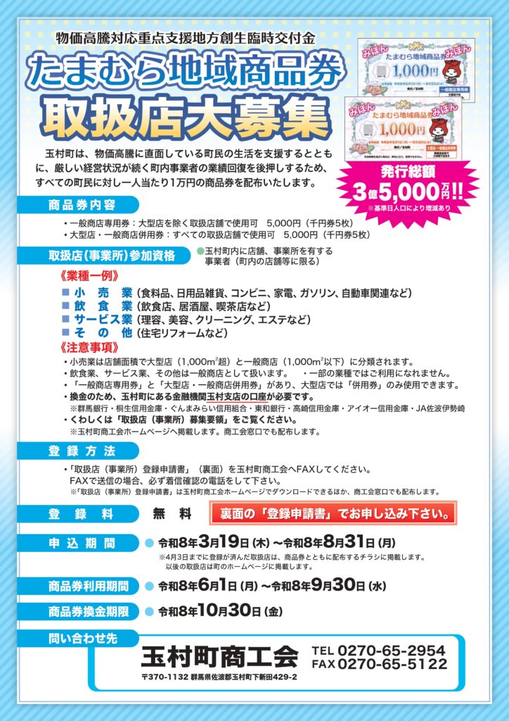 玉村町と玉村町商工会では、令和8年度に物価高騰に直面している住民支援及び厳しい経営状況が続く町内中小事業者の業績回復を後押しするため「たまむら地域商品券」を下記及び募集チラシのとおり発行します。
